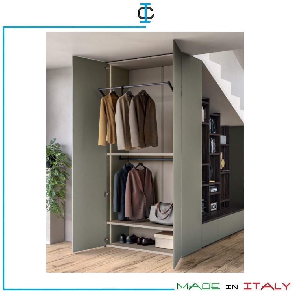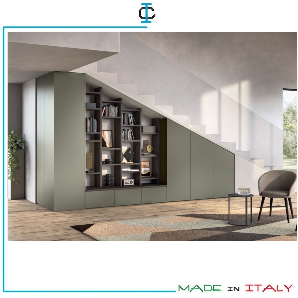 Armadio SottoScala con libreria. Armadio composto da : 4 armadi, 3 cestoni, 4 librerie. Armadio con struttura in Pannello Ecologico in classe E1 in finitura con tinte a scelta.