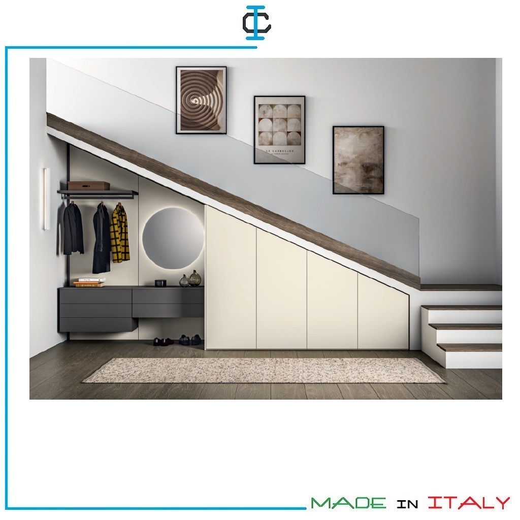 Armadio SottoScala per ingresso. Armadio composto da : 5 cassetti, 1 appendiabito, 1 specchio, 4 armadi. Armadio con struttura in Pannello Ecologico in classe E1 in finitura con tinte a scelta.