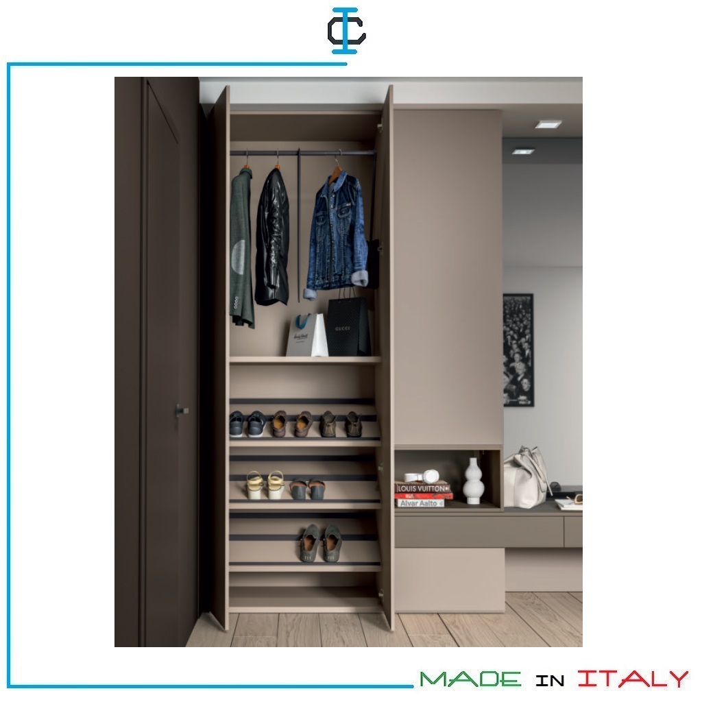 Armadio disimpegno con scarpiera. Armadio composto da : 1 armadio con scarpiera, 1 armadio con vano a giorno, 2 cassetti.