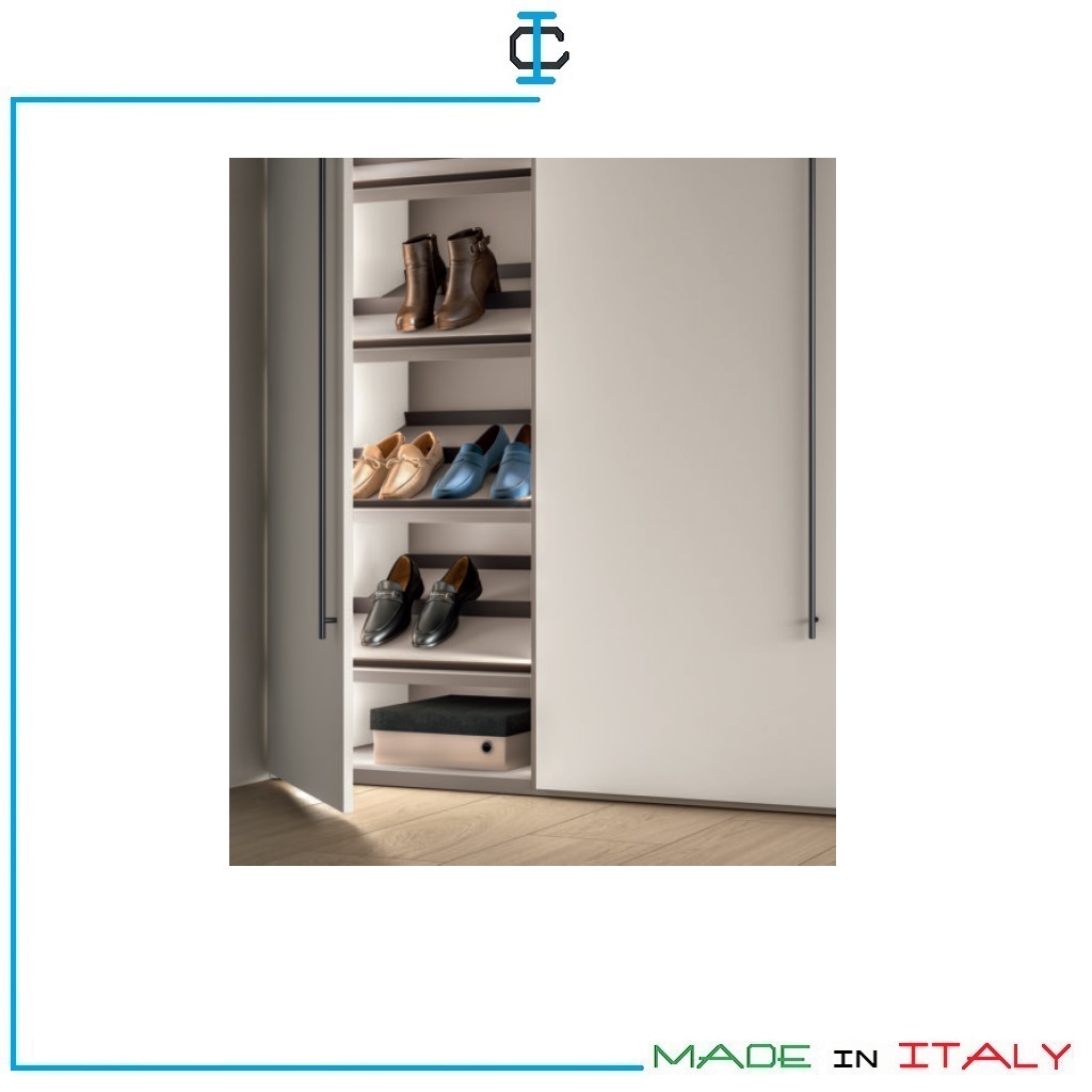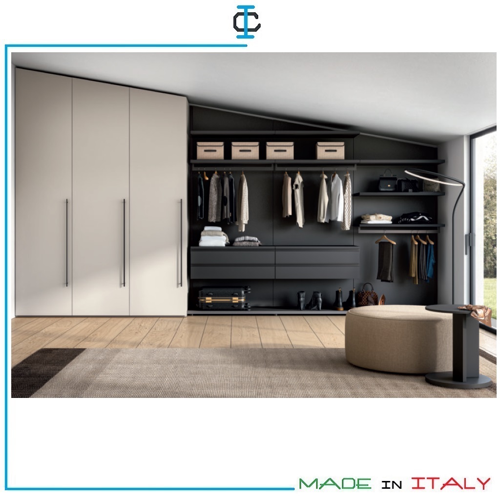 Armadio Mansardato con scarpiera. Armadio composto da : 3 armadi di altezza differenziata, 3 moduli cabina armadio con 4 casetti.